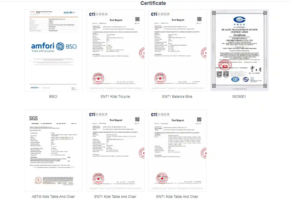 Certificazioni comeEN71EASTMindicare che il nstriciclo per bambini e neonati perché è stato sottoposto a test specializzati per verificare se i materiali sono atossici, se gli angoli possono tagliare le mani, se le parti sono solide e hanno soddisfatto gli standard di sicurezza.